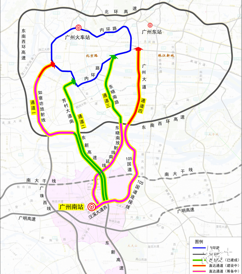通道二:东新高速(已通)-芳村大道南(已完成快速化改造,4.8公里)-洲头咀隧道(已通),13.8公里,需时10分钟;