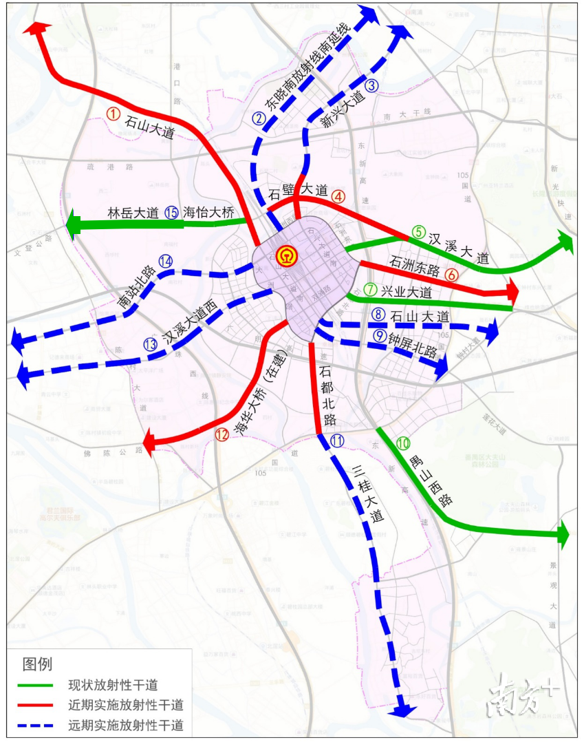 同时延续原控规规划的放射路网骨架,加快10条放射性主干道建设,打造南站本体15分钟快速集散系统。同时南站地区建设16座公交站场,包括4座枢纽站和12座首末站;社会停车场11处,约6100个泊位。