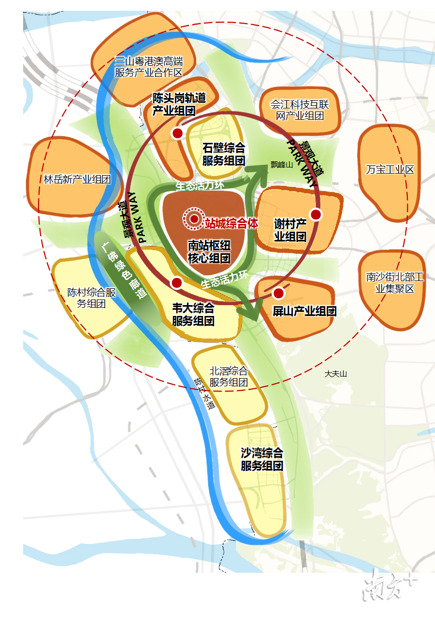 面向粤港澳大湾区全面合作的门户枢纽,引导南站及周边地区从交通集散枢纽,向粤港澳大湾区高端要素全球配置的门户枢纽转型。